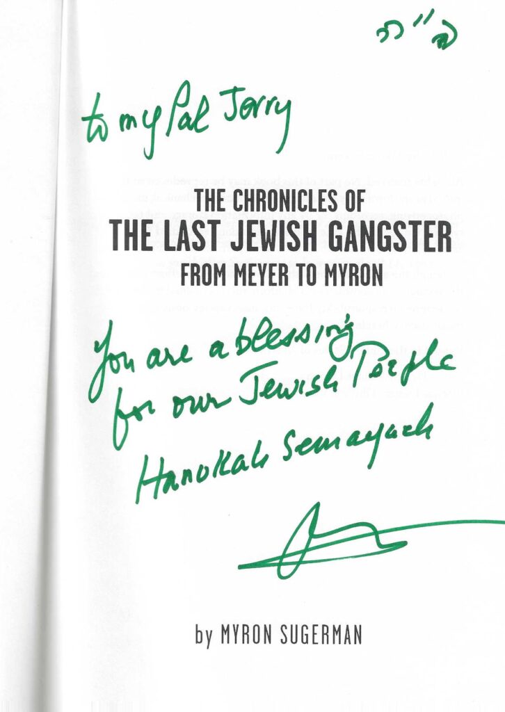 In chapter 15 of his most readable book, in which not all the narrow escapes he lived were from the Feds, Myron recounts some of the work, at no small personal risk, he undertook in South America in consultation with and in aid of relentless Nazi-hunter Simon Wiesenthal. So Myron, now in his late eighties, had more than gangster Jewish connections in his long colorful career. His book, The Chronicles of the Last Jewish Gangster: From Meyer to Myron, makes quite a read.