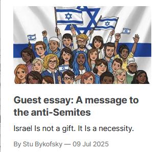 Stu writes on his website on many different current concerns of his followers, but we’ll just reference (sans hyperlinks, go find them yourself on Stu’s site) some of his particular Jewish interest postings here. You can find and comment on the latest on https://www.stubykofsky.com/.
